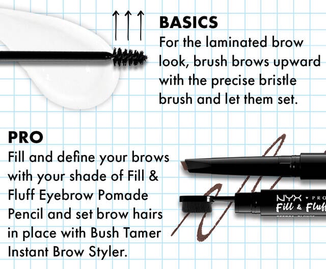 For the laminated brow look, brush brows in an upward motion with precise bristle brush, and let them set. fill in gaps with your favorite pigmented brow product!